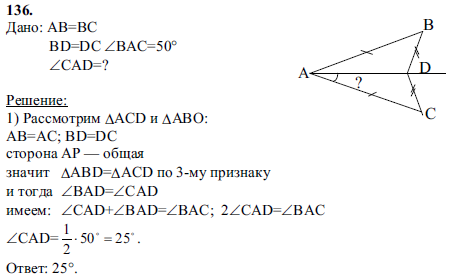 На рисунке 52 (с. 31) АВ =AC, BD = DC и ∠BAC = 50°. Найдите ∠CAD