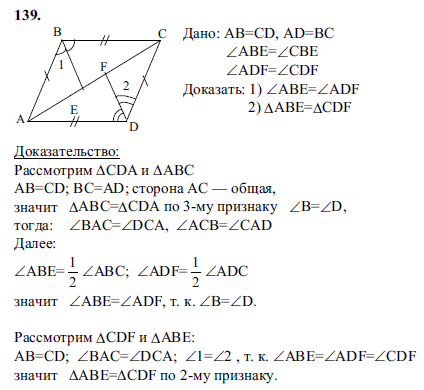 Отрезки BE и DF — биссектрисы в равных   треугольниках,   проведенные   к   равным   сторонам,   поэтому   BE = DF   (задача   128)   и   ZABE = ZADF,   ZABE =  ZCDF.