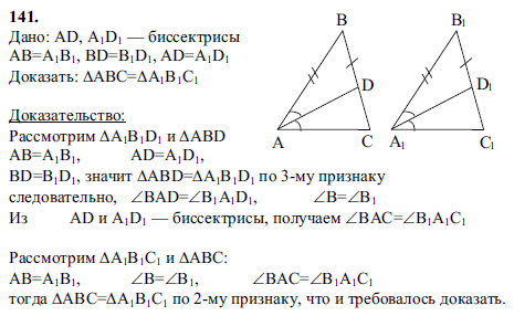 Решение. AABD = AA\B\D\ по третьему признаку равенства треугольников (рис.74). Отсюда следует, что Zl = Z2 и АВ = ZB\. Так как AD и A\D\ — биссектрисы и Zl = Z2, то ZA = /_А\. ААВС = ДА1.В1С1  по второму признаку равенства треугольников (АВ = AiBi, ZA = ZAi, ZB = ZBX).