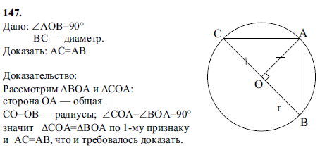 На окружности с центром О отмечены точки А и В так, что угол АОВ — прямой. Отрезок ВС — диаметр окружности. Докажите, что хорды АВ и АС равны