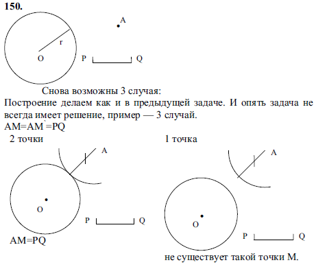 Решение. Построим окружность с центром А, радиус которой равен PQ (рис.81). Если эта окружность имеет общую точку М с данной окружностью, то М — искомая точка, поскольку AM = PQ. Если же построенная окружность не имеет общих точек с данной окружностью, то задача не имеет решения.