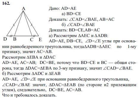 На рисунке 92 треугольник ADE равнобедренный, DE — основание. Докажите, что: а) если BD=CE, то ∠CAD=∠BAE и AB=АС; б) если ∠CAD=∠BAE, то BD = CE и AB=АС