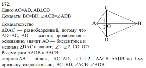 На рисунке 96 AC=AD, AB⊥CD. Докажите, что BC=BD и ∠ACB=∠ADB.