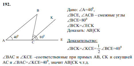 Решение. Пусть луч CF — биссектриса угла ВСЕ, равного 80° (рис. 120). Тогда Zl = Z2 = 40°, поэтому Z2 = ZA. Но углы А и 2 — соответственные при пересечении прямых CF и АВ секущей АС, следовательно, CF || АВ.