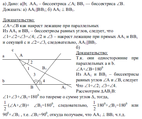 Две параллельные прямые пересечены секущей. Докажите, что: а) биссектрисы накрест лежащих углов параллельны; б) биссектрисы односторонних углов перпендикулярны