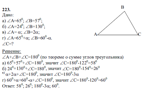 Найдите угол С треугольника ABC, если: a) ∠A=65°, ∠B = 57°; б) ∠A = 24°, ∠B= 130°; в) ∠A=α, ∠B=2α; г) ∠A = 60°+α, ∠B = 60°-α