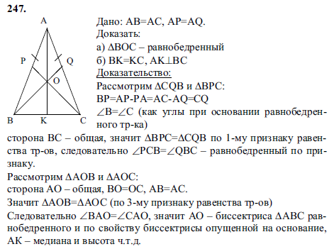На рисунке 130 AB=АС, AP=AQ. Докажите, что: а) треугольник BОС — равнобедренный; б) прямая ОА проходит через середину основания ВС и перпендикулярна к нему
