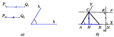 Построим угол XAY, равный данному углу hk, и отложим на луче АХ отрезок AB, равный данному отрезку P1Q1 (рис. 144, б). Для построения вершины С искомого треугольника заметим, что расстояние от точки С до прямой AB должно равняться P2Q2. Поэтому точка С должна лежать на прямой р, параллельной прямой AB и такой, что расстояние между прямыми р и AB равно P2Q2. Следовательно, искомая точка С есть точка пересечения прямой р и луча AY.