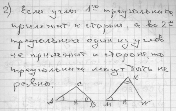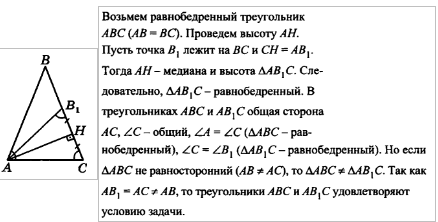 Так как АВ ф АС, то точка D не совпадает с точкой С. Поэтому треугольники ABC и ABD не равны. Вместе с тем эти треугольники имеют общую сторону АВ, общий угол В и равные углы CAB и ADB, т. е. эти неравные треугольники удовлетворяют условиям задачи.