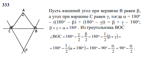 Прямые, содержащие биссектрисы внешних углов при вершинах В и С треугольника ABC, пересекаются в точке О. Найдите угол BOC, если угол А равен а