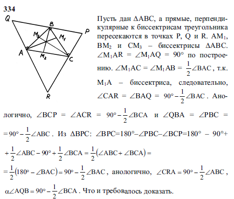Решение. Пусть ABC — данный треугольник. В ходе решения задачи 333 было установлено, что углы одного из трех образовавшихся треугольников равны 90°a/2, 90°-a/2— и 90°-c/2. Аналогично доказывается, что углы двух других треугольников также равны
