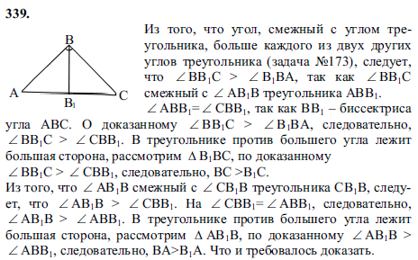 Решение. Внешний угол треугольника больше каждого из углов  треугольника,   не   смежных   с   ним   (см.   задачу   173).   Поэтому ZAB\B > b/2 (рис.213) и ZCB\B > b/2. Применяя теорему о соотношениях между сторонами и углами треугольника к треугольникам АВВ\ и СВВ\, получим: