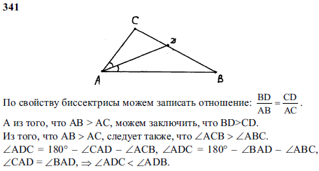 В треугольнике ABC сторона АВ больше стороны АС, отрезок AD — биссектриса. Докажите, что ∠ADB >∠ADC и BD > CD