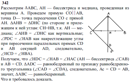 Решение. Рассмотрим треугольник ABC, биссектриса AD которого является медианой: BD = DC. Допустим, что АВ > АС. Тогда согласно утверждению, сформулированному в задаче 341, BD > DC, что противоречит условию задачи. Предполагая, что АВ < АС, мы придем к аналогичному противоречию. Следовательно, АВ = АС.