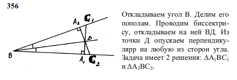 Решение. Пусть hk — данный угол с вершиной В (рис.228). Построим сначала биссектрису этого угла и отложим на ней отрезок BD, равный данному отрезку. Затем построим прямую, проходящую через точку D и перпендикулярную к лучу h. Обозначим точку пересечения этой прямой со сторонами угла h и к буквами А и С. Треугольник ABC — искомый.