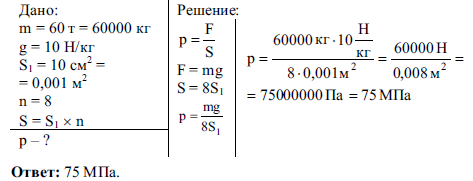 Чему равно давление на рельсы четырехосного вагона массой 60 т, если площадь соприкосновения одного колеса с рельсом 10 см2