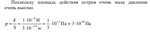 Оса вонзает свое жало с силой 0,00001 Н. Почему, действуя такой маленькой силой, она прокалывает кожу животного? Какое давление производит жало на кожу, если площадь его острия равна 0,000000000003 см2