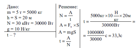 Мощный башенный кран может поднять груз массой 5 т. Если для подъема груза данной массы двигатель крана развивает мощность 30 кВт, то в течение какого времени груз будет поднят на высоту 20 м