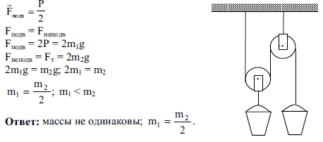 Ведра с водой подвешены на блоках(см. на рис.219). Одинаковы ли массы воды в ведрах, если они находятся в равновесии