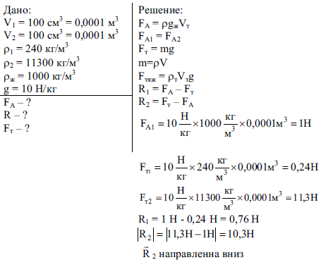 Ответ: 1 Н; 0,24 Н; 11,3 Н; 0,76 Н; 10,3 Н; вверх у пробки; вниз у свинца. Тело всплывает, если рт < рж; тонет, когда рт > рж