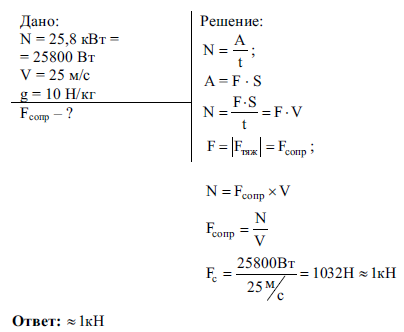 Трактор, работая на вспашке, развивал мощность на крюке 25,8 кВт при скорости движения 25 м/с. Как велика сила сопротивления почвы при вспашке