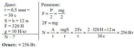 С помощью подвижного блока равномерно поднимают в течении 0,5 мин ящик с кирпичами на высоту 12 м, действуя силой 320 Н. Как велика мощность, развиваемая при подъеме ящика