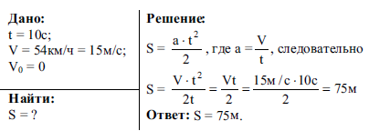 Мотоциклист трогается с места и за 10с разгоняется до скорости 54 км/ч. Какой путь он успевает при этом проехать
