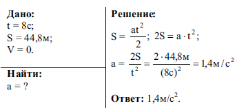 С каким ускорением должен затормозить автобус, чтобы, проехав за 8 с путь 44,8м, остановиться