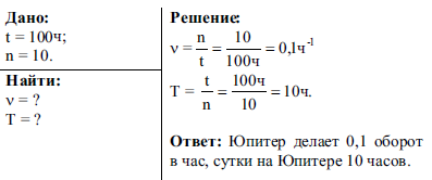 За 100ч Юпитер (самая большая планета Солнечной системы) совершает примерно 10 оборотов вокруг своей оси. С какой частотой вращается эта планета? Сколько времени длятся сутки на Юпитере