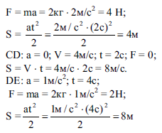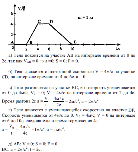 На рисунке 94 изображен график зависимости скорости тела от времени. Опишите характер движения тела. На каком из участков тело покоится? движется с постоянной скоростью? разгоняется? движется с уменьшающейся скоростью? Чему равно ускорение тела на каждом участке? Какой путь проходит тело за все время движения? Определите силу, действующую на тело на каждом участке, если масса тела равна 2 кг