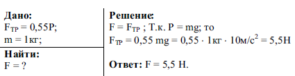 Какую наименьшую силу следует приложить к стальному бруску, находящемуся на горизонтальной деревянной поверхности, чтобы сдвинуть его с места? Максимальная сила трения покоя стали по дереву составляет примерно 0,55 веса бруска. Масса бруска 1кг