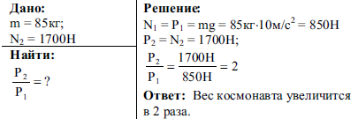 В ракете находится космонавт массой 85кг. Во время старта ракеты сила реакции опоры, действующая на космонавта, увеличилась до 1700 Н. Во сколько раз увеличился при этом вес космонавта
