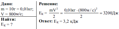 Чему равна кинетическая энергия пули массой 10г, летящей со скоростью 800 м/с