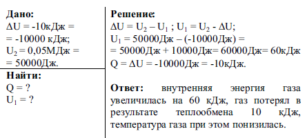 Чему была равна внутренняя энергия газа, если в результате теплообмена она уменьшилась на 10 кДж и стала равной 0,05 МДж? Как при этом изменилась температура газа - повысилась или понизилась? Какое количество теплоты было получено газом