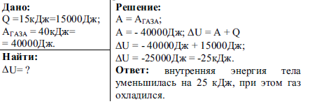 При передаче газу количества теплоты 15 кДж он совершил работу, равную 40 кДж. Чему равно изменение внутренней энергии газа? Охладился газ или нагрелся