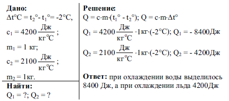 Пользуясь таблицей 8, вычислите устно количество теплоты, выделяющееся при охлаждении на 2°С: а) воды массой 1 кг; б) льда массой 1 кг