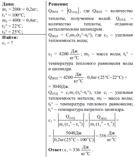 Металлический цилиндр массой 200г нагрели в кипятке до 100°С и затем опустили вводу массой 400г, имеющую температуру 22°С. Через некоторое время температура воды и цилиндра стала равной 25°С. Чему равна удельная теплоемкость металла, из которого изготовлен цилиндр? Тепловыми потерями пренебречь