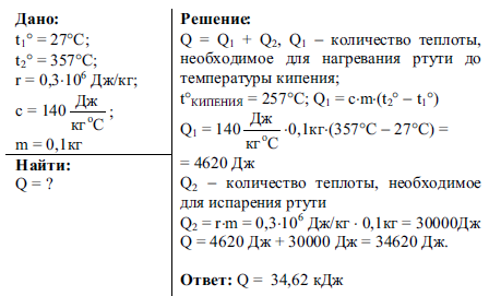 Рассчитайте количество теплоты, необходимое для превращения в пар ртути массой 0,1 кг, взятой при температуре 27°С