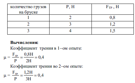 Вывод: Вычислили коэффициент трения в трех опытах и убедились, что он от веса тела не зависит.