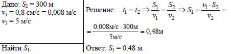 В подрывной технике употребляют сгорающий с небольшой скоростью бикфордов шнур. Какой длины надо взять шнур, чтобы успеть отбежать на расстояние 300 м, после того как его зажгут? Скорость бега равна 5 м/с, а пламя по шнуру распространяется со скоростью 0,8 см/с