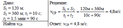 Вагон, двигаясь под уклон с сортировочной горки, проходит 120 м за 10 с. Скатившись с горки и продолжая двигаться, он проходит до полной остановки еще 360 м за 1,5 мин. Определите среднюю скорость вагона за все время движения