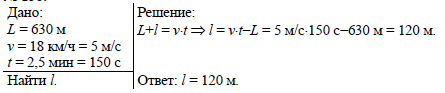 Определите длину поезда, движущегося равномерно по мосту длиной 630 м со скоростью 18 км/ч, если поезд проходит мост в течение 2,5 мин