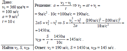 Самолет, летевший прямолинейно с постоянной скоростью 360 км/ч, стал двигаться с постоянным ускорением 9 м/с2 в течение 10 с в том же направлении. Какой скорости достиг самолет и какое расстояние он пролетел за это время? Чему равна средняя скорость за время 10 с при ускоренном движении