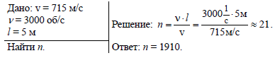 Пуля, вылетевшая из ствола автомата Калашникова, обладает скоростью 715 м/с и вращается вокруг оси, совпадающей с направлением движения, с частотой 3000 об/с. Считая скорость постоянной, определите число оборотов, совершенных пулей на пути 5 м