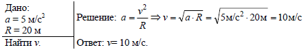 Автомобиль движется по закруглению дороги, радиус которой равен 20 м. Определите скорость автомобиля, если центростремительное ускорение равно 5 м/с2