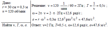 Шкив радиусом 30 см имеет частоту вращения 120 об/мин. Определите частоту, период обращения, угловую скорость шкива и центростремительное ускорение точек шкива, наиболее удаленных от оси вращения