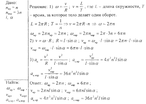 Карусель и крыша над каруселью одинакового диаметра вращаются вокруг вертикальной оси О в одном направлении с частотами 3n и n соответственно (рис. 4д). Скат крыши длиной l образует с осью вращения угол а. Определите: 1) угловые скорости карусели и крыши над ней, 2) линейные скорости крайних точек карусели и крыши, 3) центростремительное ускорение этих точек
