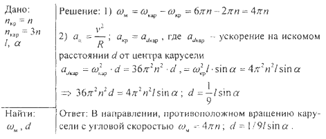 Ознакомьтесь с условием предыдущей задачи. Определите, с какой угловой скоростью и в каком направлении должен идти мальчик по карусели вокруг оси ее вращения, чтобы крыша относительно него оставалась неподвижной. На каком расстоянии от оси вращения расположены точки карусели, в которых центростремительное ускорение такое же, как и на краю крыши