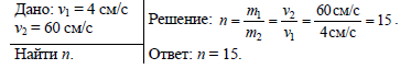 Левая тележка (см. задачу 211, в) приобрела скорость 4 см/с, правая — 60 см/с. Масса какой тележки больше и во сколько раз