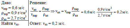 Между алюминиевым и такого же объема парафиновым шарами находится сжатая, связанная нитью пружина. Нить пережигают, и пружина, распрямляясь, приводит шары в движение. Какую скорость приобретает при этом алюминиевый шар, если парафиновый шар приобрел скорость, равную 0,6 м/с